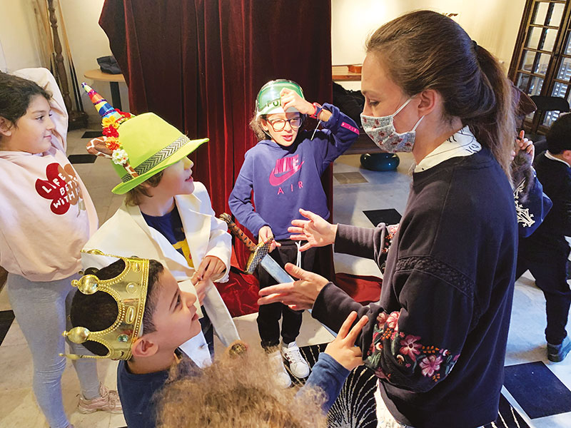 Costumes et accessoires sont prêts dans la grande salle du service Culturel et attendent les apprentis comédiens… Les voilà qui arrivent dans un joyeux désordre, manifestement heureux d’être là et de retrouver Mélanie qui anime l’atelier ce mercredi au Domaine Formigé.