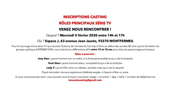 Montfermeil, territoire d’artistes et de créations ! Le casting de la série Le Monde de Demain produite par les Films du Bélier, co-réalisée par Katell Quillévéré (Suzanne, Réparer les Vivants) et Hélier Cisterne (Vandale, Le Bureau des Légendes) et qui retrace l’histoire de l’arrivée du hip-hop à Paris au début des années 80 à travers la formation du groupe mythique Suprême NTM, recherche ses rôles principaux… à Montfermeil !