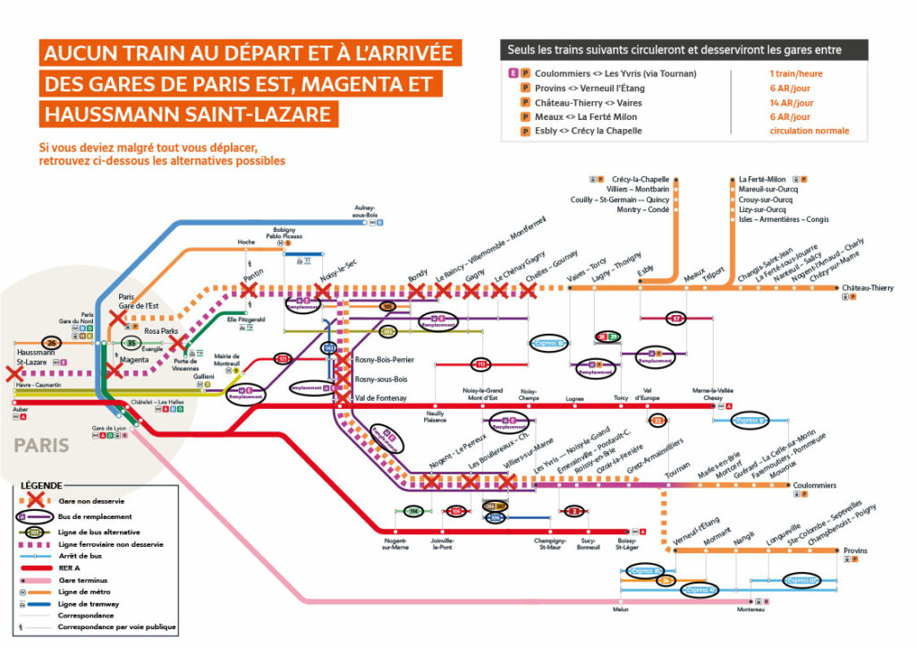 Ce week-end sera donc consacré à de très nombreux essais fonctionnels et sécuritaires sur les commandes d’itinéraires et d’énergie. Des navettes bus seront mises à disposition pour notre secteur (entre Chelles et Paris) à partir des gares de Chelles, Le Chénay Gagny et Gagny vers le métro Gallieni (L3). D’autres navettes seront au départ des gares du Raincy, et Bondy vers Bobigny métro ligne 5. Mais ces navettes bus ne pourront jamais remplacer la capacité des trains.
