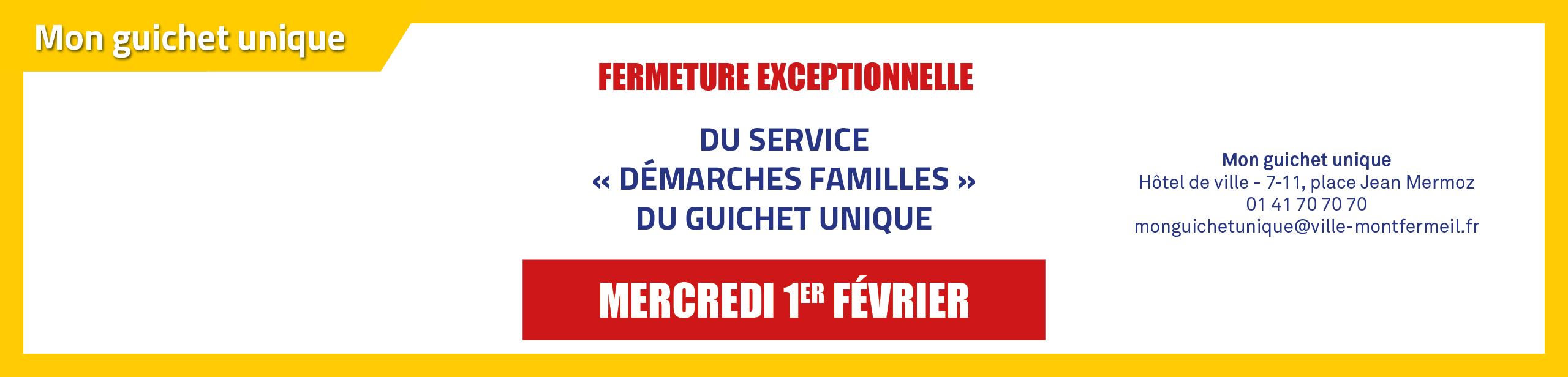 Nous vous informons que le service Démarches Familles du guichet unique de la Mairie de Montfermeil sera exceptionnellement fermé le mercredi 1er février 2023 !