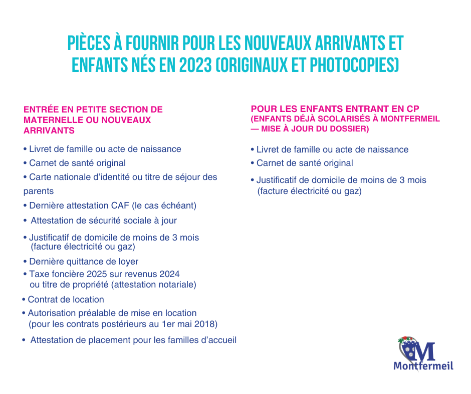 Les inscriptions scolaires à Montfermeil ont généralement lieu entre début février et fin mars pour une rentrée au mois de septembre de l’année en cours. Possibilité d’inscription toute l’année pour une scolarisation en cours d’année.